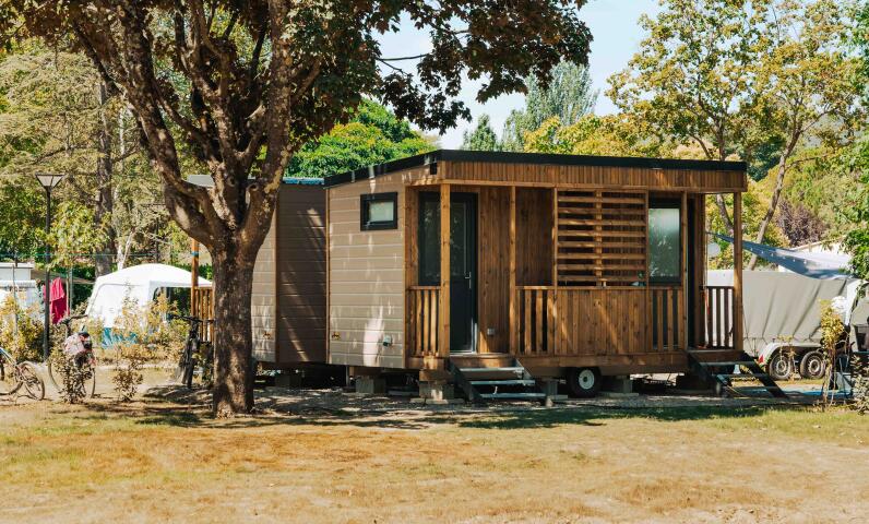 The private sanitary block is located directly on the pitch. It includes a shower, a seperate toilet, a washbasin with mirror and a table-top fridge. A sink for dishes is located a the entrance, under a small porch.