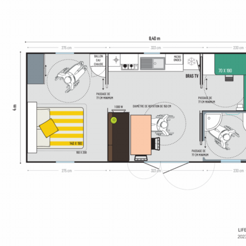 Mobile home adapted for people with reduced mobility, with spacious rooms, specially equipped to accommodate wheelchair users. Located close to activities.