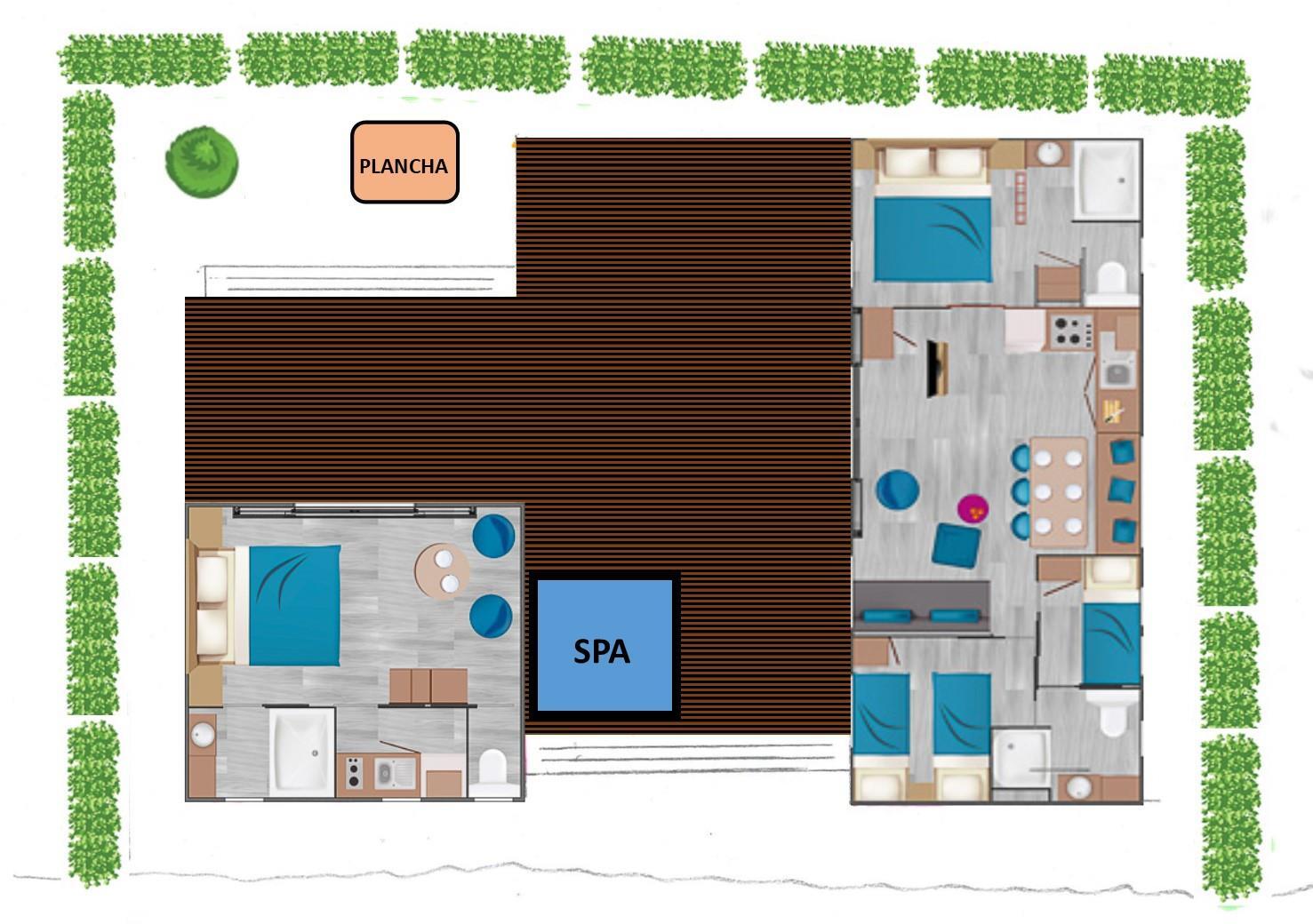 A 3-bedroom Sunêlia Luxe Taos connected by the terrace with an independent master suite Sunêlia Luxe Taos, i.e. 4 bedrooms and 3 bathrooms, or 59 m² of interior space and 56 m² of terrace to be shared by up to 8 people.