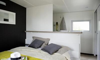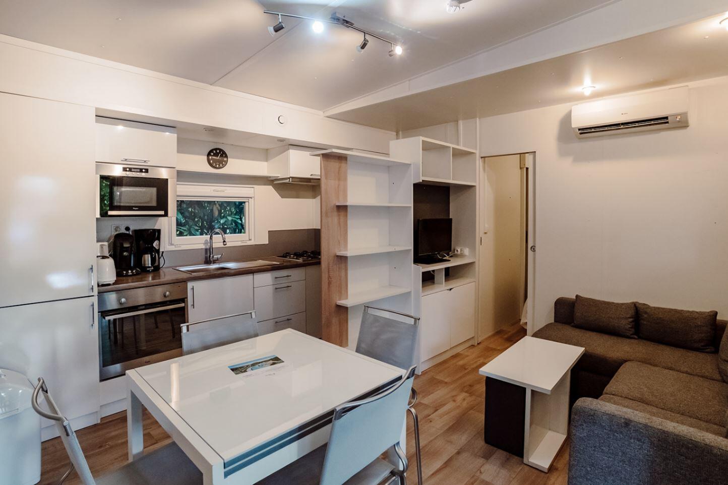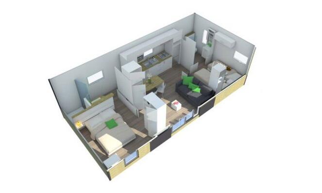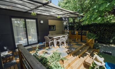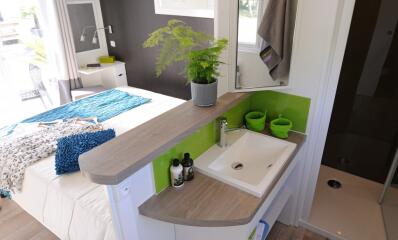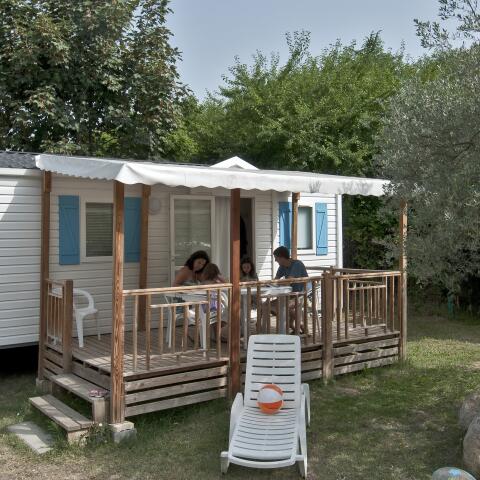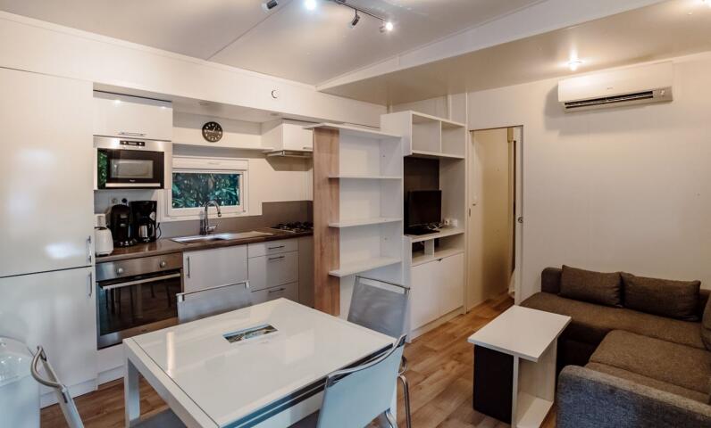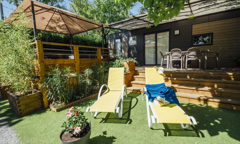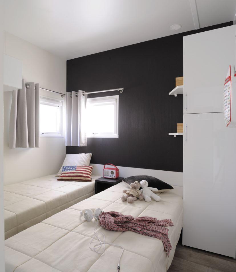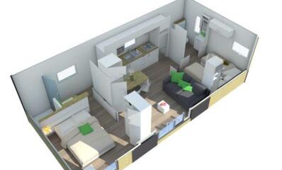 New generation of mobile-homes with an innovative and simple design. With 3 bedrooms and 2 bathrooms/WC, these mobile homes are incredibly comfy. Located in a calm area at the end of the camping site.