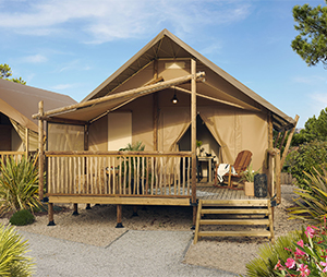A stylish tent, perfectly integrated into the landscape, which combines wood, canvas and fabric in a harmonious way.