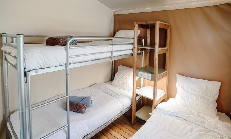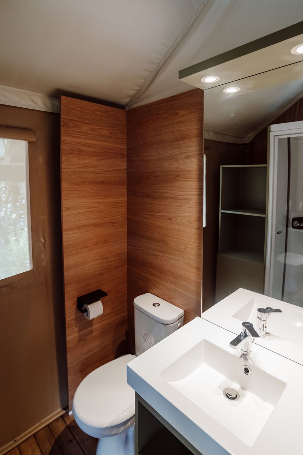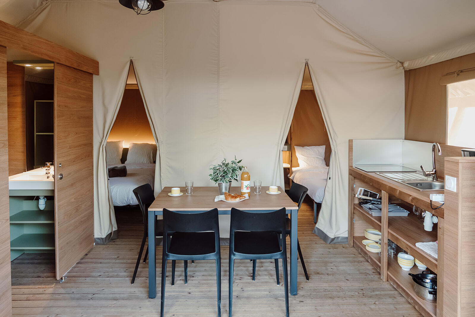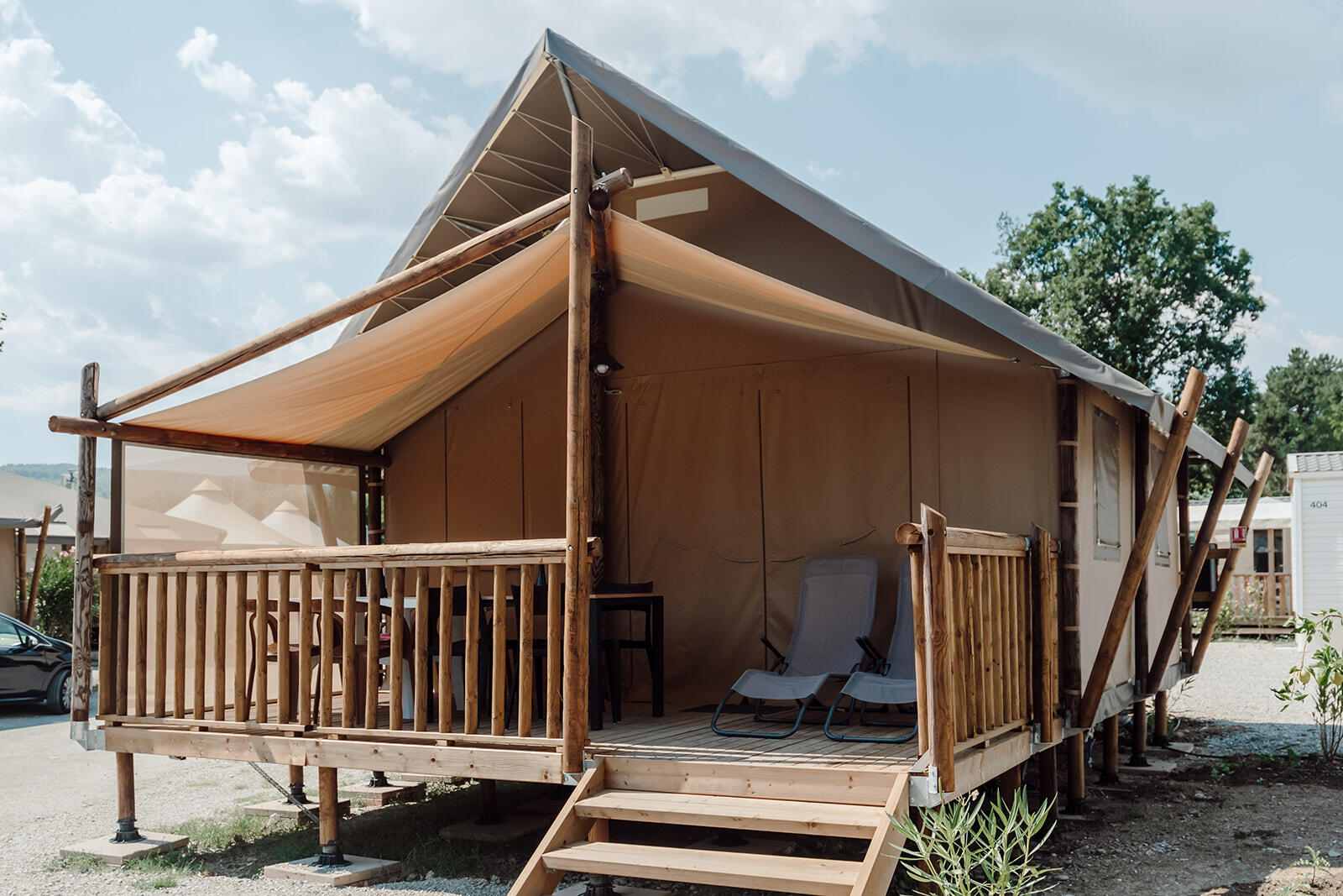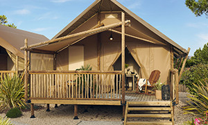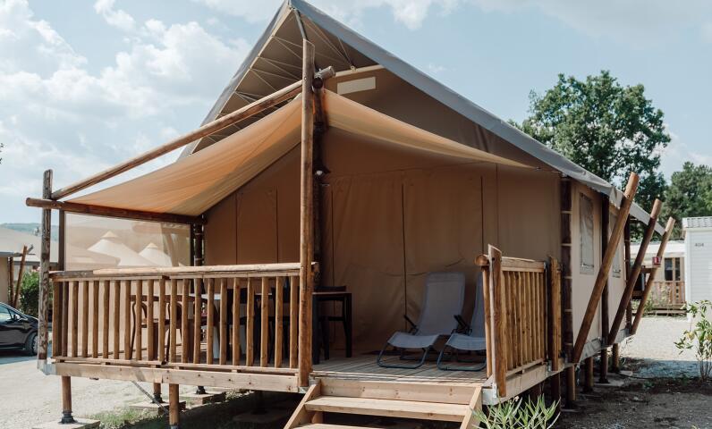 Tente stylisée et parfaitement intégrée dans la nature qui allie de façon harmonieuse le bois, la toile et le tissu.
