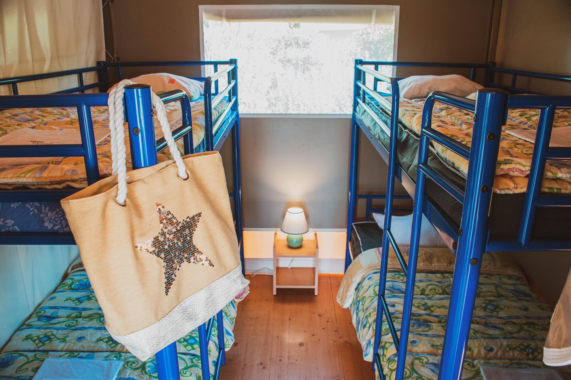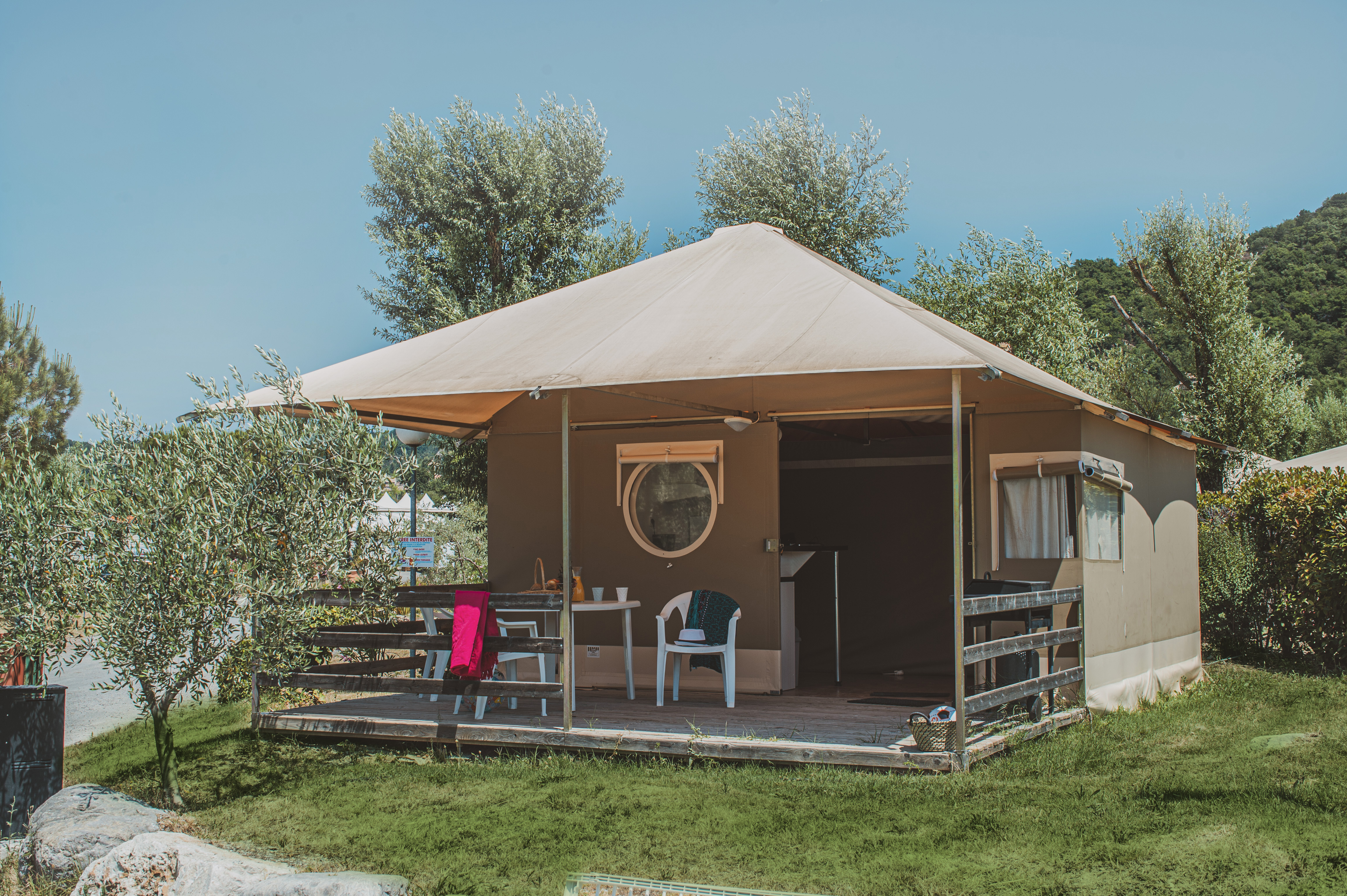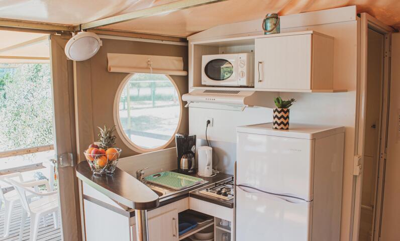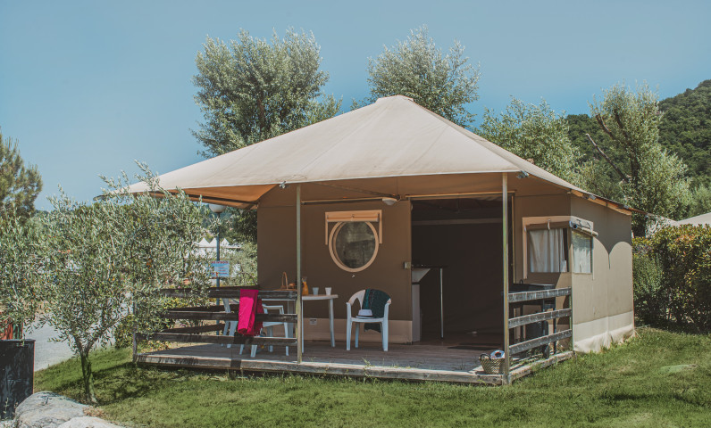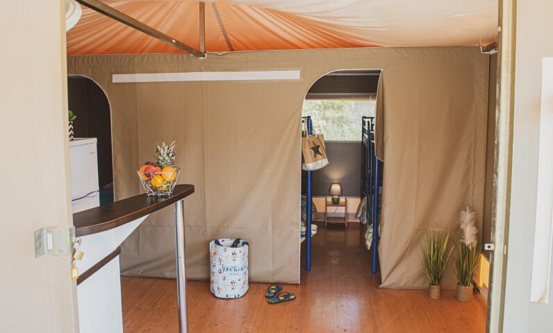Les Sunlodge sont de grandes tentes de toile écrue équipées de douche et WC.
