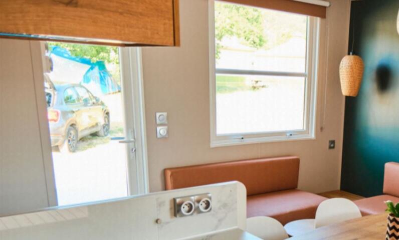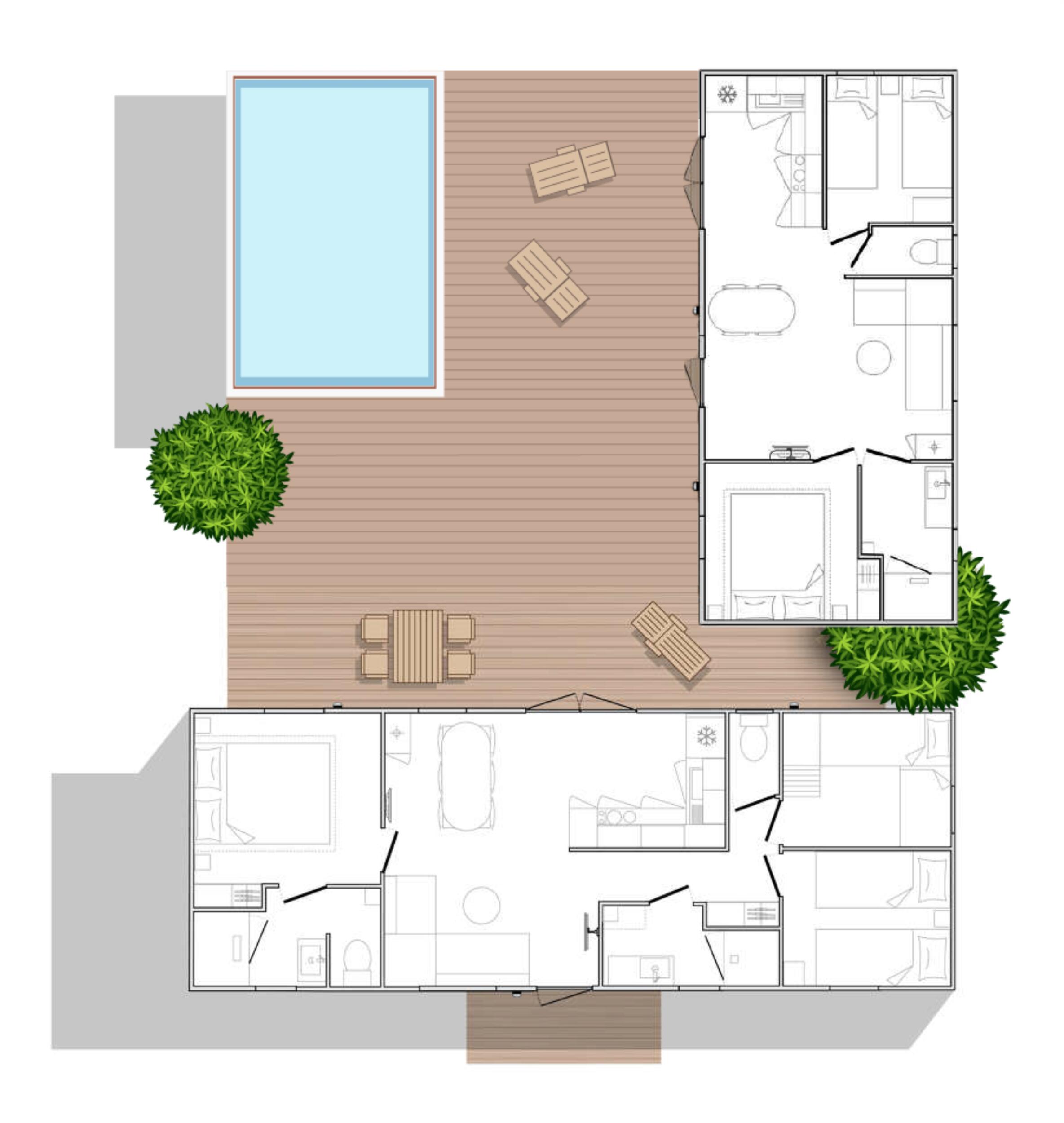 Découvrez notre nouveau concept, conçu spécialement pour des vacances en famille, cet assemblage de deux mobil home réuni par la même terrasse vous propose une piscine privative de 10m².