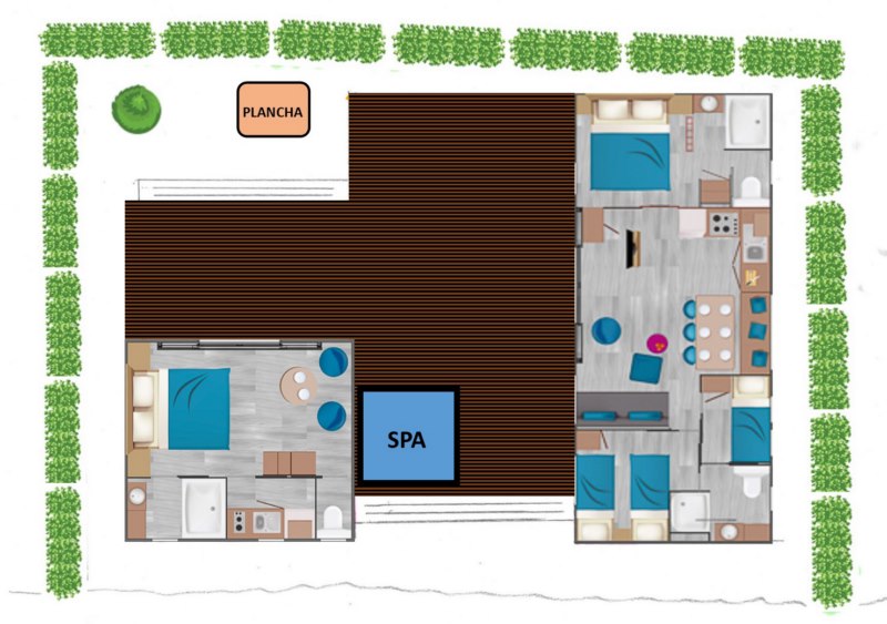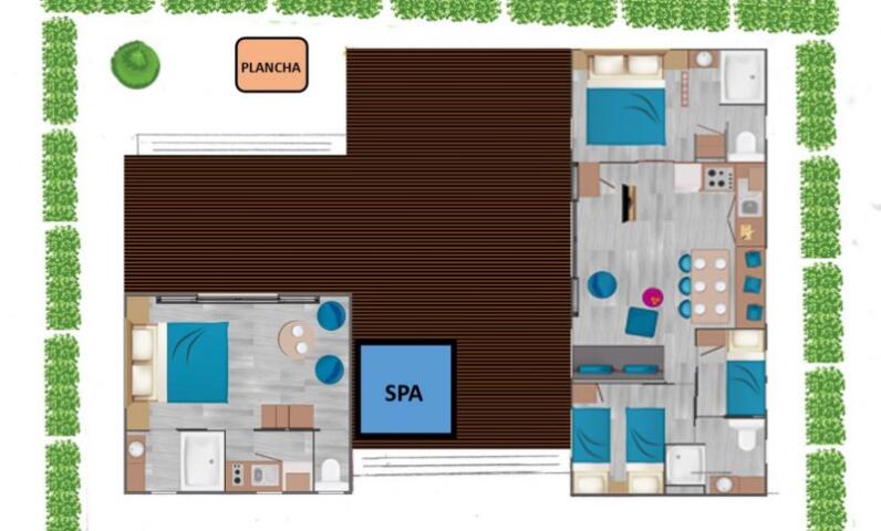 Un Sunêlia Luxe Taos 3 chambres relié par la terrasse à une suite parentale Sunêlia Luxe Taos indépendante, soit 4 chambres et 3 salles de bain, soit 59 m² d'espace intérieur et 56 m² de terrasse à partager par maximum 8 personnes.