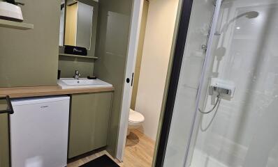 Le sanitaire privé est situé directement sur l'emplacement. Il comprend une douche, une WC séparé, un lavabo avec miroir et un frigo table top. Un évier pour la vaisselle se trouve à l'entrée, sous un abri.