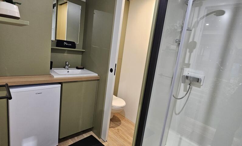 Het privé sanitaire bevindt zich direct op de plaats. Het bestaat uit een douche, een apart toilet, wastafel met spiegel en tafelmodel koelkast. Een gootsteen voor de afwas bevindt zich bij de ingang onder een afdakje.