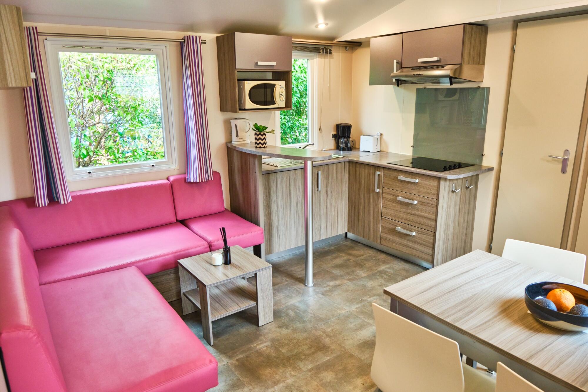 Klassieke stacaravan met 2 slaapkamers en een grote, gezellige woonkamer. De ouderslaapkamer heeft een bed van 160 cm en directe toegang tot de badkamer, terwijl de kinderslaapkamer 3 bedden heeft.