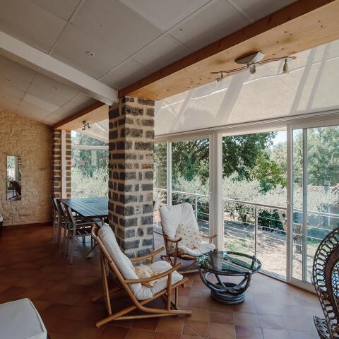 Overdekt houten terras met tuinmeubelen en twee ligstoelen.