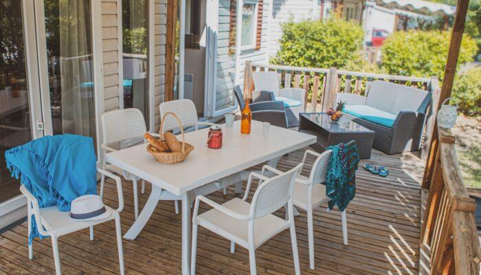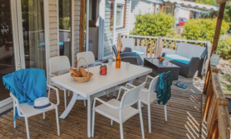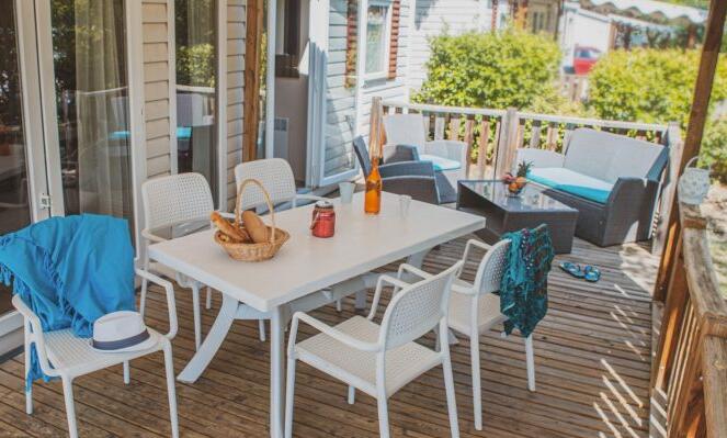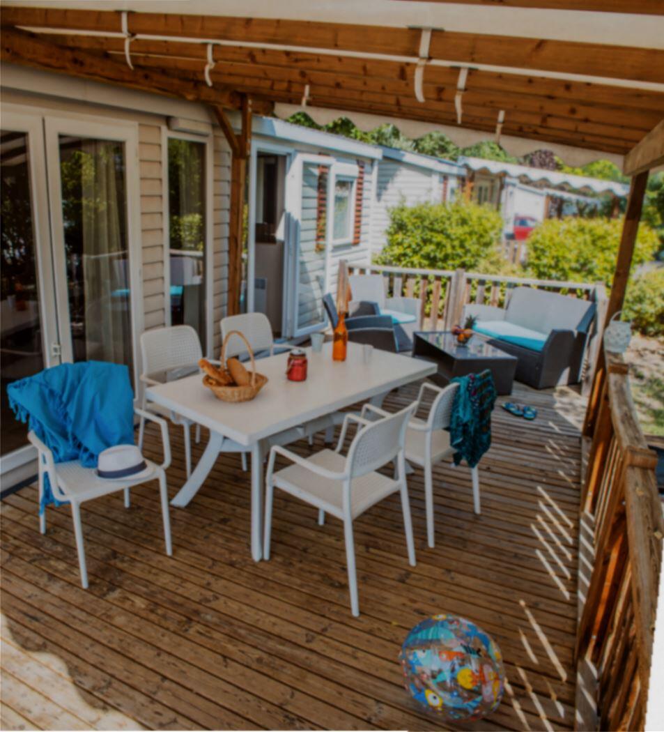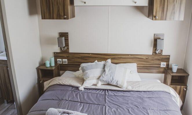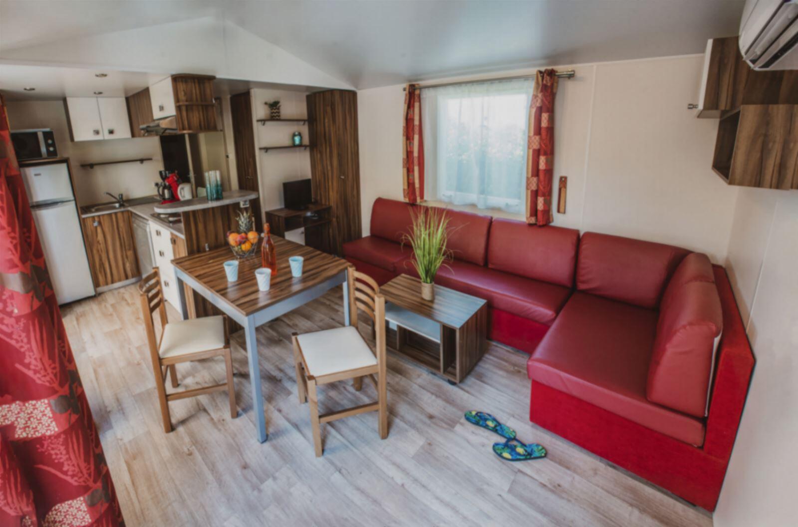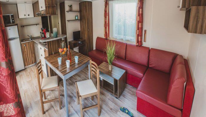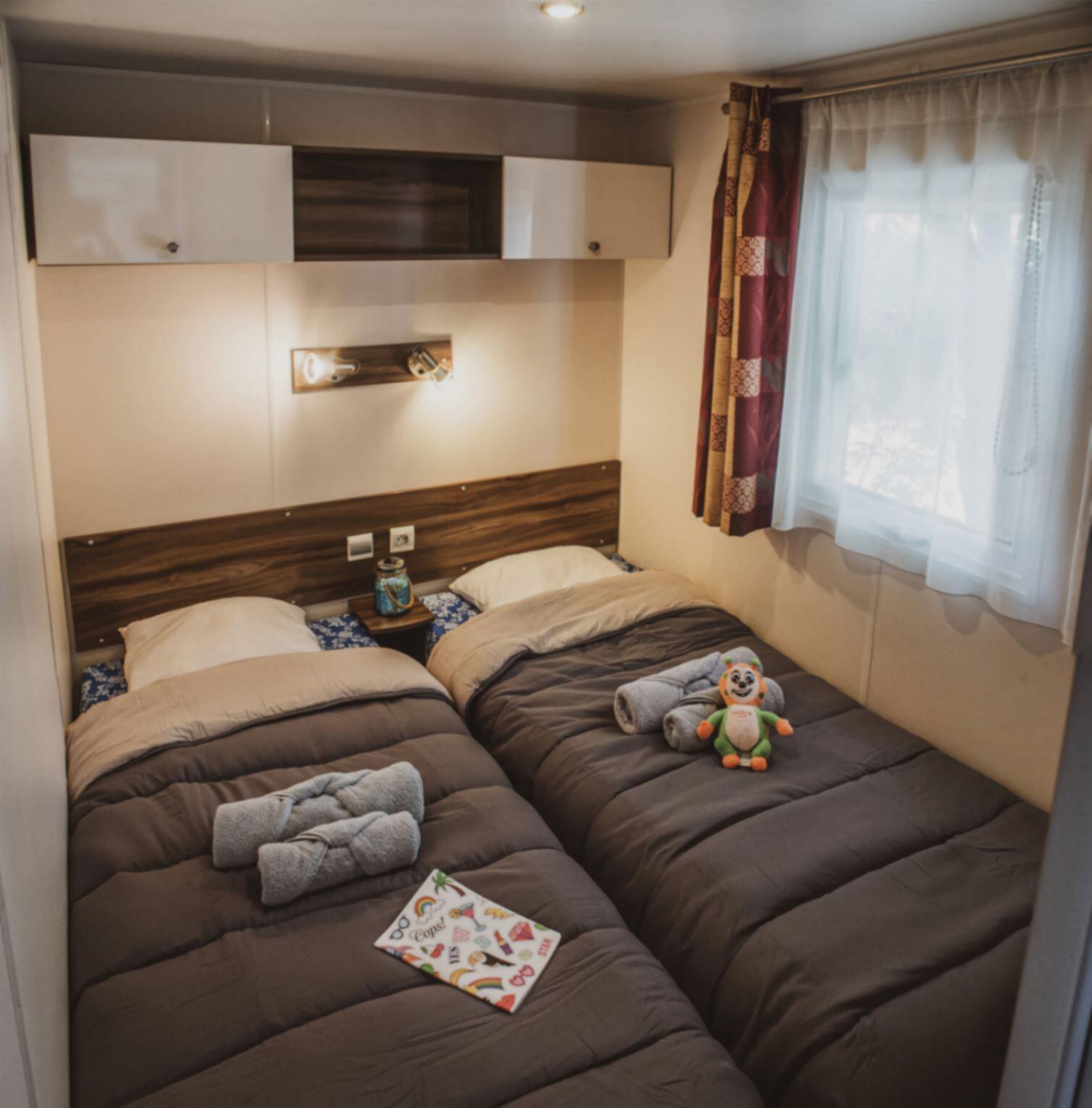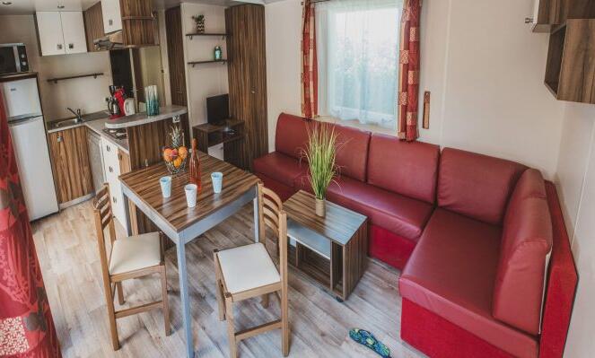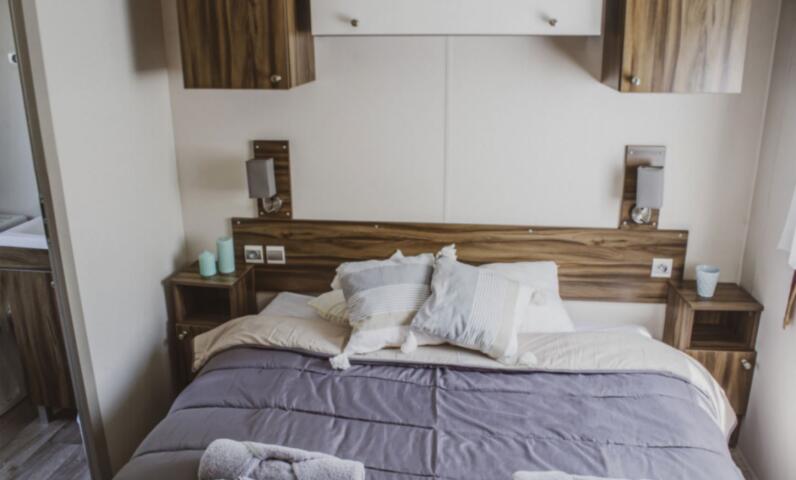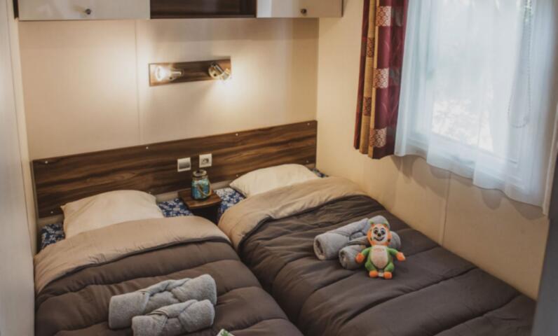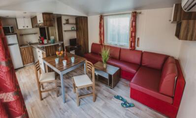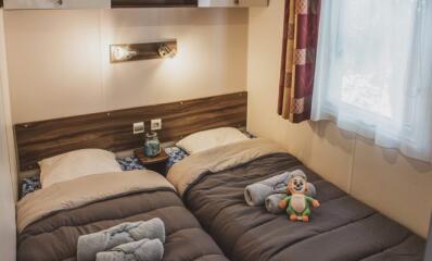 Stacaravan met 3 slaapkamers, uitgerust met vaatwasser, airconditioner en televisie.